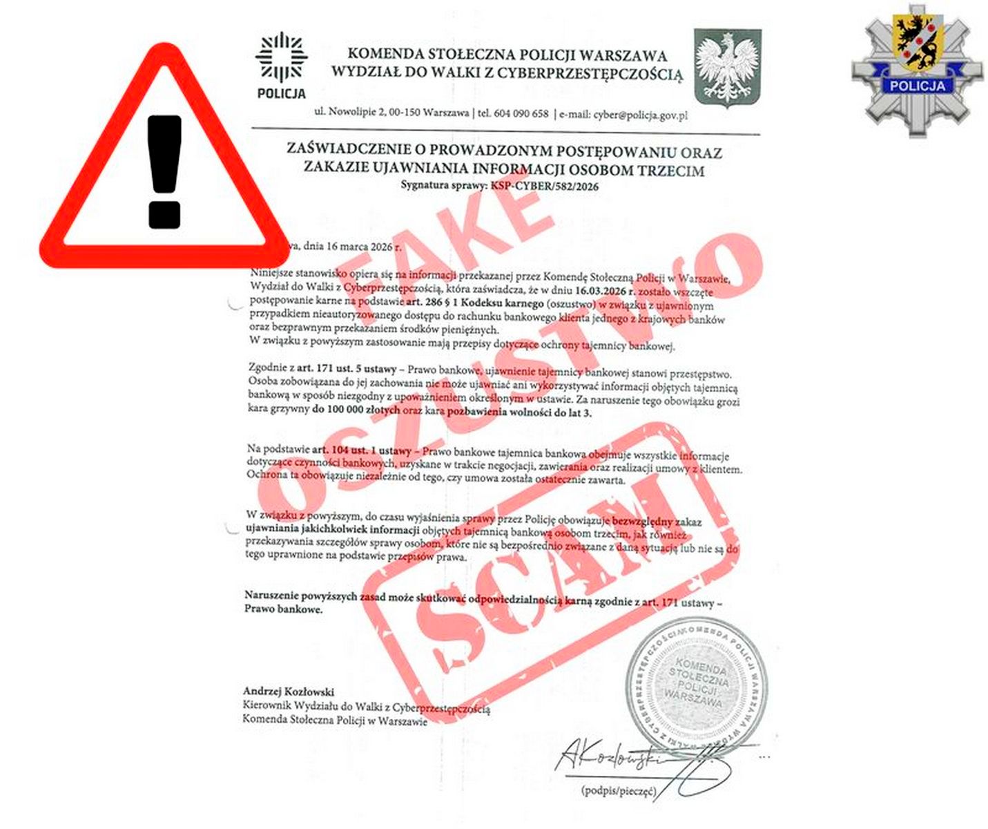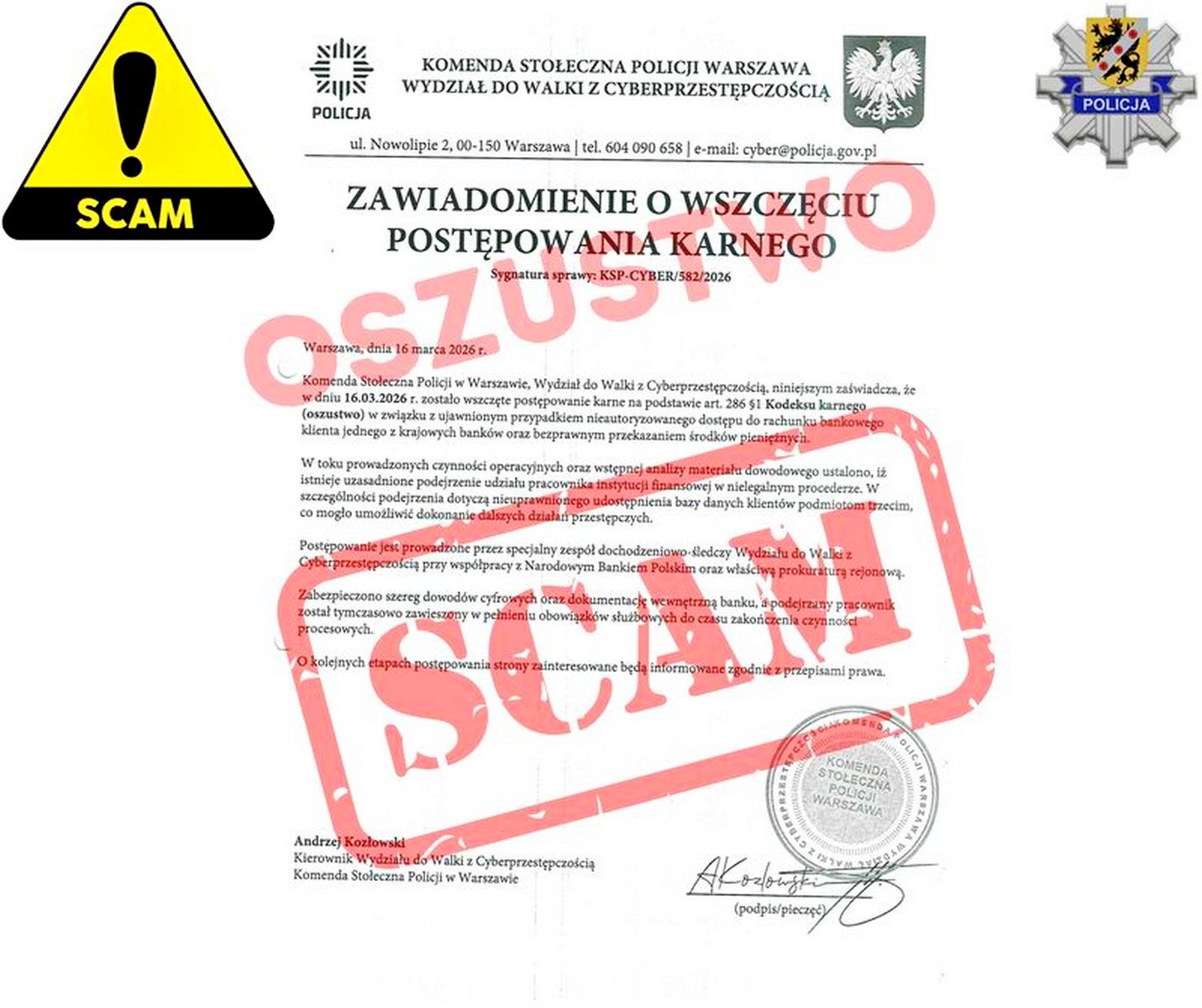 – W efekcie, działając pod wpływem presji, kobieta wpłaciła 15 000 zł do wpłatomatu, które natychmiast zniknęły z jej konta. Co więcej, okazało się, że otrzymała także fikcyjną wiadomość mailową, z której miało wynikać, że kontaktują się z nią stołeczni policjanci. Przestępcy załączyli tam różne sfałszowane pisma wraz z instrukcją, gdzie pokrzywdzona ma przelać pieniądze – informuje asp. sztab. Anetta Potrykus, oficer prasowy wejherowskiej policji.