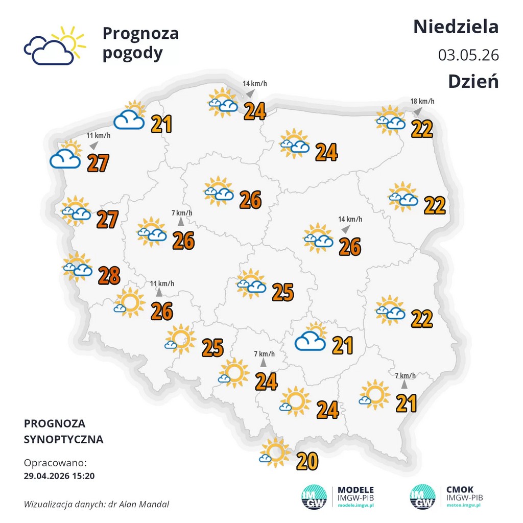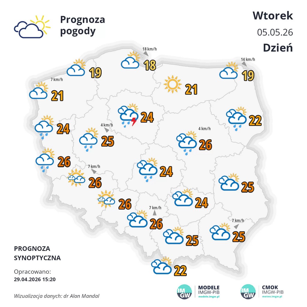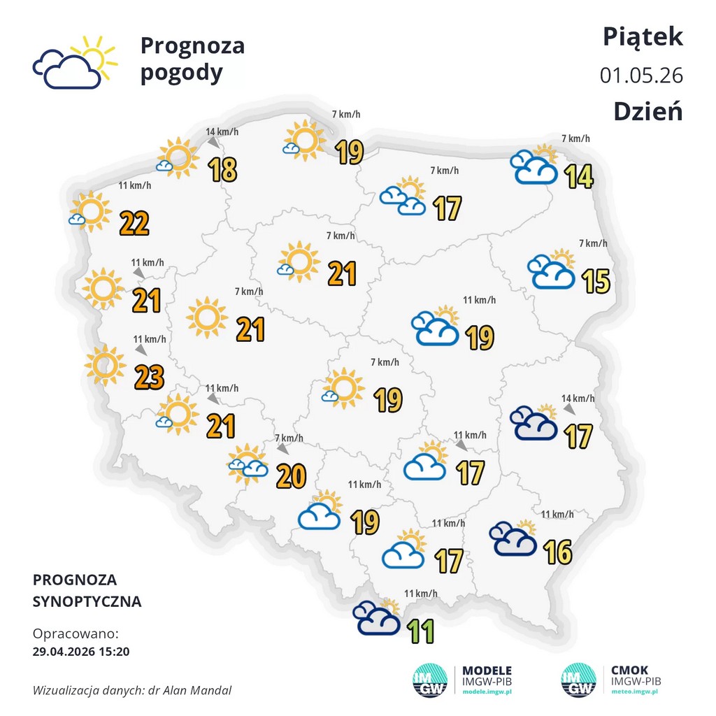 Zachmurzenie małe i umiarkowane, okresami duże. W dzień lokalnie przelotne opady deszczu. Temperatura minimalna od 8°C do 11°C.