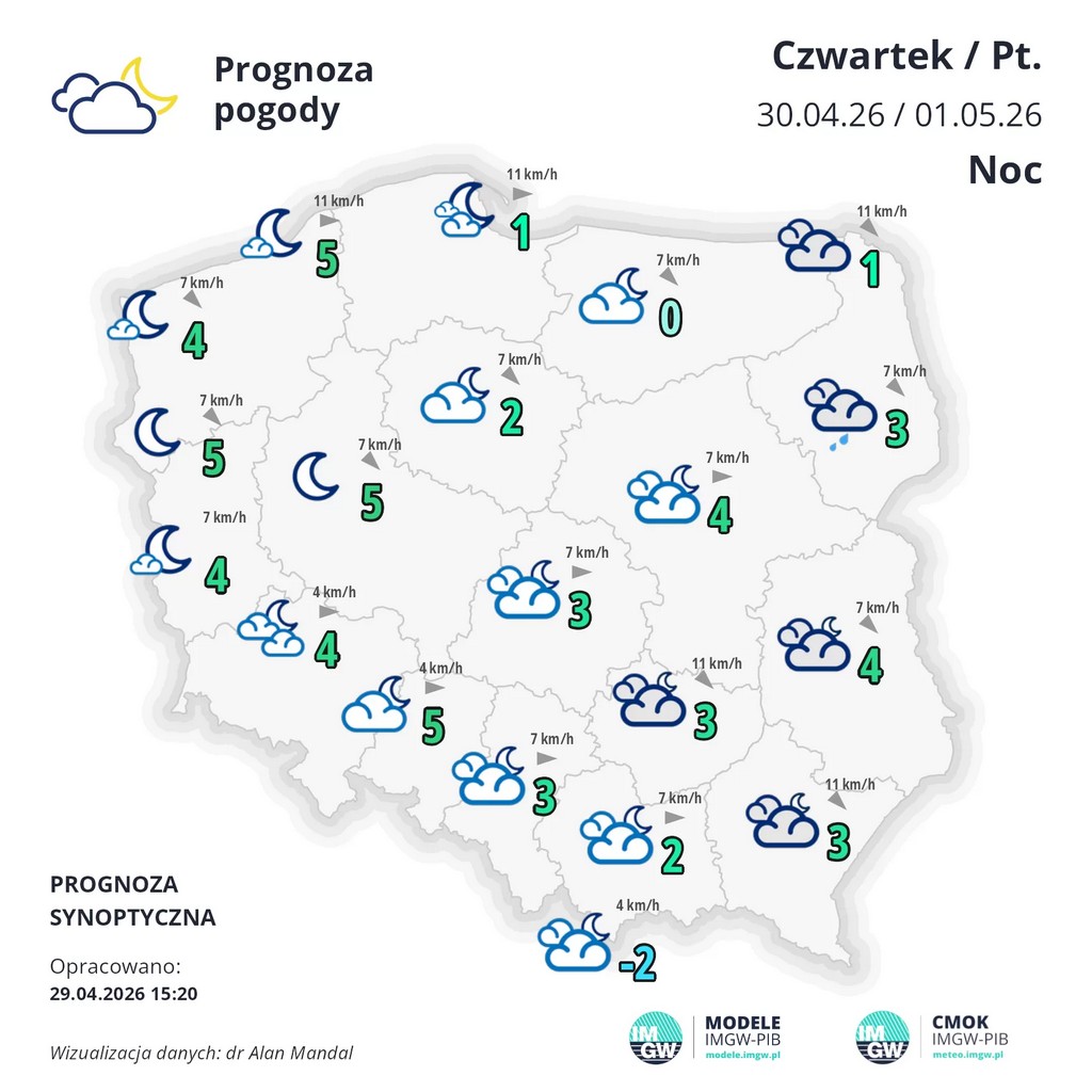 Bezchmurnie lub zachmurzenie małe. Lokalnie możliwe silne zamglenia. Temperatura minimalna od 0°C do 2°C, lokalnie przy gruncie około -2°C, nad morzem od 4°C do 5°C. Wiatr słaby, z kierunków zachodnich.