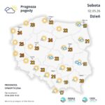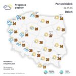 Temperatura maksymalna od 18°C do 21°C, nad morzem około 15°C. Wiatr słaby i umiarkowany, z kierunków zachodnich stopniowo skręcający na kierunki północne.