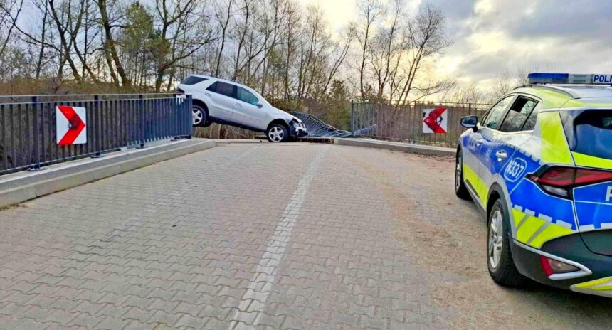 Poniedziałek Wielkanocny. W Bolszewie Mercedes uderzył w barierki mostu i prawie wpadł do rzeki